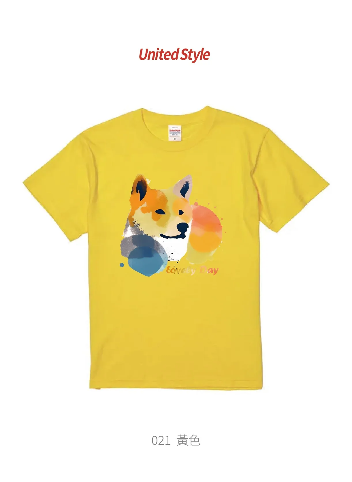 水彩 柴犬(Shiba Inu)。暈染的橘、黃、藍、灰色塊來描繪柴犬的頭部,營造出一種溫暖、柔和的氛圍。